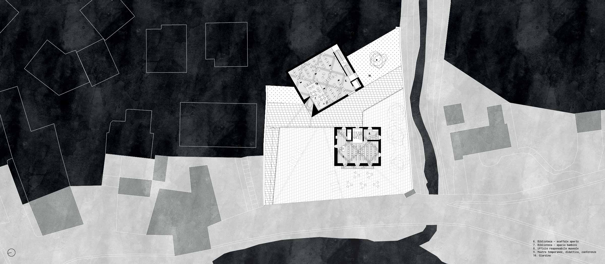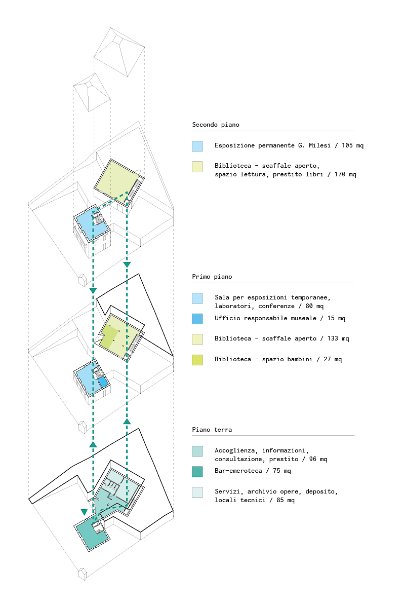 Il programma di concorso prevedeva lo sviluppo di un edificio pubblico da destinare a nuova biblioteca comunale e museo dedicato al pittore bergamasco Giuseppe Milesi; l’atteggiamento rispetto alla preesistenza, una residenza signorile degli anni Venti del Novecento poi adibita a caserma e infine dismessa, era lasciato a discrezione dei progettisti.